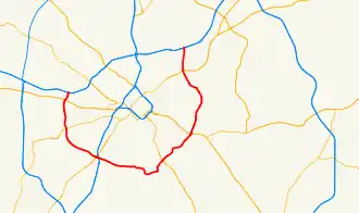 The idea of a ring around uptown, roughly along what were the city limits at the time, was first suggested in the 1960 city transportation plan. In order to implement this, a number of existing two-lane roads around the south and east sides of Charlotte were connected and widened. Woodlawn Road, then running from Tryon Street (NC 49) east to Fairfax Drive, was through-routed with Runnymede Lane via a new bridge across Briar Creek and a short piece of Barclay Downs Drive. Wendover Road was extended northeast from its end at Randolph Road to Independence Boulevard (US 74), absorbing a short piece of Beal Street (east of Ellington Street) and most of Brookhurst Drive (Monroe Road to just shy of Independence Boulevard). Eastway Drive was already complete, and Sugar Creek Road only required a railroad bridge between The Plaza and Atmore Street, which allowed the short Highway Place to become part of Sugar Creek Road.[7][8] These roads, along with a proposed southwestern segment that would partially replace Yorkmont Road, were added to the state highway system (where not already part of it) as secondary roads, and, except for Sugar Creek Road, to the federal-aid primary system. Not every turn was eliminated; plans for a straighter Runnymede Lane west of Colony Road and a bypass of Sharon Road were not carried through.[9]