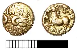 - ^ The coin is thought to have been issued by Tasciovanus, king of the Catuvellauni from c. 20 BCE to c. 10 CE[5]