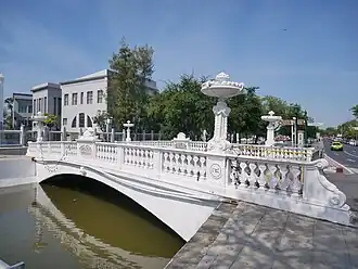 It was built in 1913, financed from King Rama VI's private fund, to celebrate his 34th birthday. The bridge has four plaster posts decorated with western style stucco.