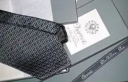 In the late 1920s, Charvet was considered to produce "the finest cravats in the world",[135] with either conservative designs or "decidedly original"[136] patterns, such as postage-stamps[137][138] (See below) or much more "modernist"[139] patterns. At an exhibition called "L'art de la soie" held at the Musée Galliera in Paris in 1927, Charvet presented dressing gowns and neckties in matching patterns,[140] together with pyjamas,[141] shirts and handherchieves.[142] The company developed a practice of sending merchandises to its customers for approval, allowing them to select some or none and return the rest, subsequently referred to as the Charvet method.[143] It conceived a range of free-form[144] bold printed tie patterns which gained wide popularity in the USA.[n. 15] "Its chic was in their unfussy, nonchalant bearing. To the delight of their many admirers, the Charvets' open settings facilitated blending with all kind of fancy suits ... The original Charvet prints became the first, and regrettably almost the last, bold figured necktie to symbolize upper-class taste".[148] Some such bold Charvet Art Deco ties which had belonged to John Ringling are on display at the John and Mable Ringling Museum of Art.[149] These patterns, for which charvet became a generic name,[150][151] "foreshadowed"[152] the colorful designs which became popular after the war.[153] The company also produced beach linen robes with patterns up to two feet in diameter.[154]