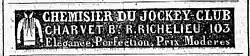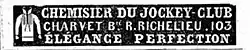 In 1839, Charvet already had some imitators,[n. 3] but still the "best supply".[24] The same year, Charvet held the title of official shirtmaker to the Jockey Club,[16] a very exclusive Parisian circle, then headed by Prince Napoléon Joseph Ney and inspired by Count Alfred d'Orsay, a famous French dandy.[25] It had about 250 members, mostly aristocrats, who, despite the name of their club, were more interested in elegance than horses. Being a member was a necessary step in order to become a lion, the term used then for a dandy.[26] In an advertisement of March 1839, Charvet, presenting himself as the Club's shirtmaker, claimed to offer "elegance, perfection, moderate prices".[27] Soon after, the claim to moderate prices was dropped (see images, right).[28]