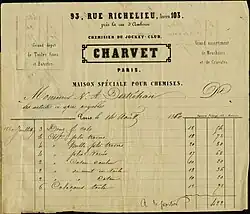 Charvet shirts were imported into the United States as early as 1853 (See figure right).[100] By 1860, Charvet's shirts turnover was equally divided between luxury bespoke shirts sold in the Paris store and ready made shirts for export, particularly to Russia, Great-Britain and Havana.[101] Also, following the custom of the time, designs and models were sold to American stores, to be locally reproduced.[102][103] In the 1920s, Charvet's name was associated in the United States with linen fabrics in "startingly floreated" patterns, used for shirt bibs and cuffs.[104] Nevertheless, into the middle of the 20th century, Charvet was selling only bespoke shirts in the Paris store.[n. 7]