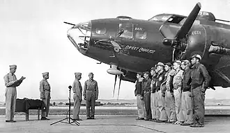 Gen. Jimmy Doolittle awards the Purple Heart to the aircrew of Boeing B-17E Fortress 41-9021 ‘Sweet Chariot’ at Chateau-dun-du-Rhumel Airfield, Algeria, July 1943.