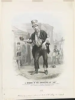 On 6 March 1860, J. Howard Rogers and Joseph C. Foster leased the building. They opened on 8 March as the National Concert Saloon. The emphasis now was on alcoholic beverages served by attractive waitresses.[13] Admission prices were 12¢ for boxes and 6¢ for the pit.[14] On 3 July, Charles J. Waters took over management and reopened as the National Theatre, a standard melodrama playhouse. George Beane replaced Waters on 6 October and restored the concert saloon theme. This lasted until December, when he gave it over to a German troupe.