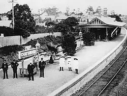 Chatswood station opened on 1 January 1890 when the North Shore line opened from Hornsby to St Leonards.[3] An island platform was built on 23 May 1900 and a third dock platform brought into use on 12 July 1919. There was a small goods yard, similar to the one at St Leonards, on the western side of the station, beyond the northern end of the platforms. The dock platform on the eastern side of the station was used for electric parcel-van traffic and also for terminating some services from the city, until these were rescheduled to terminate further along the North Shore line from January 1992.[4] It was removed in October 1994.[5] Until 1958 there was a tram terminus in Victoria Avenue beside the station. The station entrance was later integrated with a shopping centre called The Interchange in the mid-1980s.