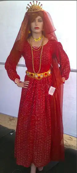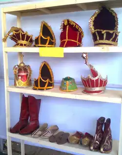 Chavittu Natakam has attractive costumes for all characters. The characters are generally dressed in roles reminiscent of ancient Greco-Roman soldiers and European kings.[1] Colored papers and silk cassava velvet cloth are used to make costumes.[1] There are also battle dress, helmet, stockings, crown, scepter and gloves.[1]