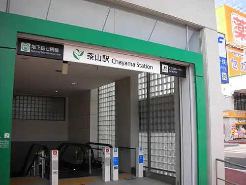 Chayama Station (茶山駅, Chayama-eki) is a subway station on the Fukuoka City Subway Nanakuma Line in Jōnan-ku, Fukuoka in Japan. Its station symbol is a picture of a tea shoot in green.