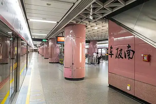 Chebeinan Station (simplified Chinese: 车陂南站; traditional Chinese: 車陂南站; Cantonese Yale: Chēbēi Nàahm Jaahm), literally Chebei South Station and formerly Huangzhou Station (黄洲站; Wòhngjāu Jaahm) when planning, is an interchange station between Line 4 and Line 5 of the Guangzhou Metro. It is located at the underground of the junction of Chebei Road[1] and Huangpu Avenue East[2] in Tianhe District.[3] It opened on 28 December 2009.[4] A public toilet was built outside the station for the convenience of passengers.[5]