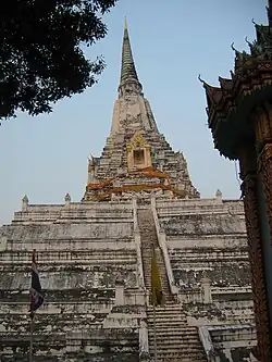 In 1569, having taken Ayutthaya, King Bayinnaung of Bago (now part of Myanmar) built a large chedi, next to the Buddhist temple of Wat Phukhao Thong, to commemorate his victory. The chedi was never completed, only the base was ever constructed when in 1587, Prince Naresuan, to commemorate his victory over the Burmese in 1584 following Ayutthaya's liberation from Burma, decided to build a Thai-style chedi over the base of the still-unfinished Burmese-style chedi.[2] Over the next two centuries the chedi fell into disrepair. In a restoration during the reign of King Boromakot (ruled 1733–1758) a new chedi in Thai style, having a square plan with indented corners, was built on the base of the ruin.[3]