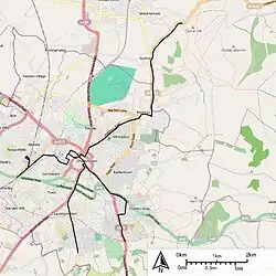 Construction began in February 1901 promoted by Nevins and Son. The work of construction involved around 120 men and a steam 'devil' was used to break up the road surface.[2] Track was laid from Lansdown Castle to the south west of Cheltenham along Gloucester Road to the Calcutta Inn, St George's Rd, St. George's Place, St. James’ Square to the Great Western Railway station, Clarence Street, North Street, Albion Street, Winchcombe Street, Prestbury Road then through Prestbury and Southam to the top of Cleeve Hill, a route of 5.5 miles (8.9 km). Electricity was drawn from the Cheltenham Corporation Electricity Department's Manchester Street sub-station.