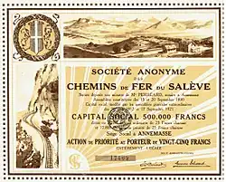 The Chemin de fer du Salève[1] (nicknamed Funiculaire du Salève in spite of the absence of any traction cable), was an electric rack railway that went up the Salève mountain in the French département of Haute-Savoie on the south side of Geneva. In the 1890s, as today, the inhabitants of Geneva enjoyed the view afforded from the Salève of the Jura, the Alps (including the Mont-Blanc) and part of lac Léman, However it was a 3-hour walk up to les Treize Arbres. This was the heyday of local railways in France, and Chemin de fer du Salève came into being in 1892. It continued operations until 1935.