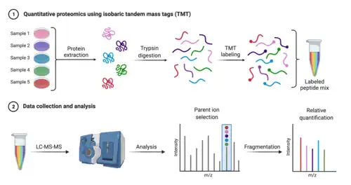 The chemoproteomic toolkit is anchored by liquid chromatography-tandem mass spectrometry (LC-MS/MS or LC-MS) based quantitative proteomics, which allows for the near complete identification and relative quantification of complex proteomes in biological samples.[5] In addition to proteomic analysis, the detection of post-translational modifications, like phosphorylation, glycosylation, acetylation, and recently ubiquitination, which give insight into the functional state of a cell, is also possible.[5] The vast majority of proteomic studies are analyzed using high-resolution orbitrap mass spectrometers and samples are processed using a generalizable workflow. A standard procedure begins with sample lysis, in which proteins are extracted into a denaturing buffer containing salts, an agent that reduces disulfide bonds, such as dithiothreitol, and an alkylating agent that caps thiol groups, such as iodoacetamide. Denatured proteins are proteolysed, often with trypsin, and then separated from other mixture components prior to analysis via LC-MS/MS. For more accurate quantification, different samples can be reacted with isobaric tandem mass tags (TMTs), a form of chemical barcode that allows for sample multiplexing, and then pooled.[5]