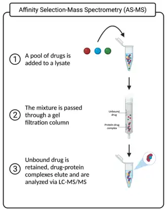 A generalized AS-MS workflow begins with the pre-incubation of purified protein solutions (i.e. target proteins) with chemical libraries in microplates. Assays can be designed to contain sufficiently high protein concentrations to prevent competition for binding sites between structural analogs, ensuring that hits across a range of affinities can be identified; inversely, assays can contain low protein concentrations to allow for distinction between high and low affinity analogs and to inform structure-activity relationships.[20] The choice of a chemical library is less stringent than other high-throughput screening strategies owing to the lack of functional readouts, which would otherwise require deconvolution of the source compound that generates biological activity. Thus, the typical range for AS-MS is 400-3,000 compounds per pool.[20] Other considerations for screening are more practical, such as a need to balance desired compound concentration, which is usually in the micromolar range, with the fact that compound stock solutions are typically stored as 10 millimolar solutions, effectively capping the number of compounds screened in the thousands.[20] After appropriate test compounds and targets are selected and incubated, ligand-protein complexes can be separated by a variety of means.[19]