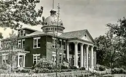 Peachtree Elementary School was built in 1947 after a fire burned the previous building on February 4, 1945.[11] The 1947 classroom building was burned in 1986.[12] The original school gym remains standing as of 2024. The Ranger School opened in 1951.[13] Unaka Elementary School was constructed in 1951 and opened on December 17.[14] The school had reported a lack of students since at least 1971, and the school closed in September 1993.[15] The Andrews Primary School was built in 1952. Marble Elementary School opened in 1956.[16] Later that year, the current Hiwassee Dam School was built and opened. The third and current Murphy High School opened in 1957. After a fire destroyed its previous building in 1962, the current Andrews High School was built. In 1969, Murphy City Schools and Andrews City Schools merged into Cherokee County Schools.