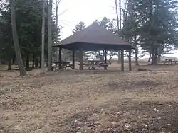 Men from CCC Camp S-88-Pa, based at nearby Lyman Run in Potter County,[27] were also active in the park. In 1939, they built a structure at Cherry Springs which is "the largest and most unique of the CCC-built picnic pavilions" in the state, and is listed on the National Register of Historic Places.[21] The pavilion overlooks PA Route 44 and is shaped like an H, with two partially enclosed structures (the vertical lines of the H) connected by a breezeway (the horizontal bar). The breezeway is a roof supported by eight log columns with log railings. The ends of the pavilion are built from log walls with white chinking, like log cabins. Each end has a large opening to the breezeway in one wall, while the other three sides are fully enclosed with a large window in the wall facing the highway, a stone fireplace and chimney on the opposite wall, and a door flanked by windows on the wall opposite the breezeway.[3][21][28]