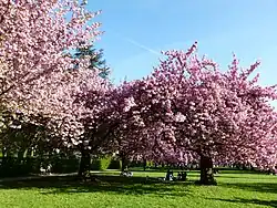 Parc de Sceaux, located in a suburb of Paris, has two orchards of cherry trees, one for white cherry blossoms (Prunus avium) and one for pink cherry blossoms (Prunus serrulata).[40] The orchards combined make up 264 trees,[41] which attract many visitors when they bloom in early April.[42] Additional plantings are present in the capital along the Seine River, near Notre-Dame de Paris, and in the Bastille area.[43]