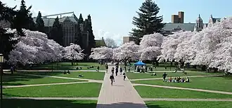 The Quad, on the campus of the University of Washington, has 29 Yoshino cherry trees.[16] According to an arborist with the university, "Historically, peak bloom in the Quad typically begins during the third full week of March and goes into the fourth week of March."[10]