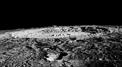 The airless, waterless environment of the Moon was assumed to experience little or no erosion, apart from the effects of extreme hot and cold (thermal erosion) during the lunar day-and-night cycle, resulting only in very fine dust particles that would settle on the surface (The Conquest of Space, Chapter 2)—meaning that steep, jutting, sharp-edged landforms in lower lunar gravity in principle could remain unchanged over long ages.[21] However, telescopic views of the Moon already had suggested by the 1940s and earlier that lunar landforms were in fact more rounded in shape. Bonestell apparently was aware of the evidence, but exercised a personal choice to depict more interesting steep and rugged lunar terrain that would become iconic in the popular imagination.[22] After the success of his imagined views of Saturn seen from its different moons for Life in 1944, Bonestell created another set of photo-like paintings for the magazine in 1946 for a journey from Earth to the Moon and back by rocket.[23] Other notable lunar scenes included a winged rocket on the Moon (cover of the book The Conquest of Space)[24] and explorers with moontractors above a lunar plain (from Collier's Weekly in 1952).[25] Bonestell's more dramatic version of lunar vistas became what many thought the Moon should have looked like.[26] As reported by special effects expert Douglas Trumbull in the 2018 documentary Chesley Bonestell: A Brush with the Future, director Stanley Kubrick chose to depict the surface of the Moon in his 1968 motion picture 2001: A Space Odyssey after Bonestell's sharp and craggy vision rather than recreate the more accurate, but visually duller, worn-down rolling vistas revealed by lunar probes in the 1960s.[27]