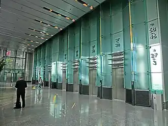 It boasts the region's fastest elevators, made by Mitsubishi Electric, maxing out at 9 metres per second. Each elevator features giant plasma displays at the top of each cabin, showing Bloomberg TV.