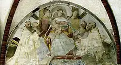Of the 13th-century cloister today only the southern side and two bays remain. It is decorated by a Virgin Enthroned with Child Honoured by Cistercians (early 16th-century), once attributed to Gaudenzio Ferrari and today to Callisto Piazza. The fresco is sided by the inscription in semi-Gothic script celebrating the church's consecration in 1221, surmounted by a stork.