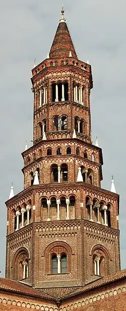 The exact date of construction of the tower is unknown, but it has been dated to 1329–1340 and attributed to Francesco Pecorari from Cremona due to its resemblance to the Torrazzo di Cremona and the belltower of the San Gottardo church in Milan. Additions from the 18th century were removed in the 1905.