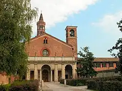The complex is accessed through a 16th-century tower commissioned by Louis XII of France; to the side there is an oratory dedicated to Saint Bernard which contains a fresco of Christ standing before Pilate, once attributed to Hieronymus Bosch but today assigned to the Swiss Hans Witz (also known as Johannes Sapidus), who was court painter in Milan during the rule of Galeazzo Maria Sforza.