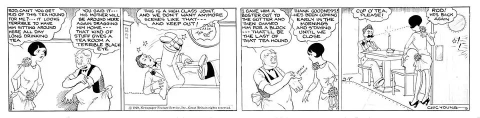 Chic Young grew up in a German-Lutheran neighborhood on the south side of St. Louis. After graduating from high school in St. Louis, he returned to Chicago where he worked as a stenographer while taking night classes at the Art Institute of Chicago. In 1921, he learned that the Newspaper Enterprise Association was seeking an artist to do a comic strip about an attractive young woman. He headed for Cleveland and earned a weekly salary of $22 (equivalent to $390 in 2024) while drawing The Affairs of Jane about a struggling film actress who dreamed of graduating from low-budget pictures to stardom. The short-lived strip, which began in 1921 on Halloween, came to a conclusion five months later on March 18, 1922. In the NEA art department, Young worked near cartoonist Gene Ahern, and the two often played pranks on each other. When a call came from King Features' J. Gortatowski offering an annual salary of $10,000 (equivalent to $176,000 in 2024), Young thought it was a prank and turned down the job. Looking for work later, he applied to Gortatowski and learned the call was legitimate.[1][3][4]