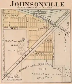 Sumner Station was located in Warren County near the intersection of this new line with the existing Wabash Railroad. At this point, the Wabash Railroad ran from northeast to southwest, and the new line ran from northwest to southeast. Local landowner G. W. Johnson saw an opportunity and established the town of Johnsonville at this intersection. A post office opened there in 1875.[4]