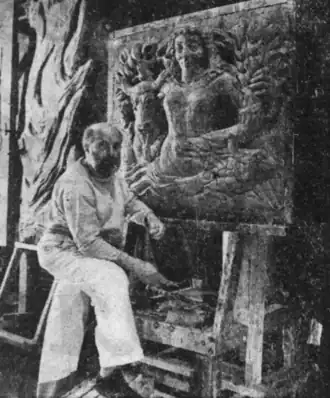 In 1953 the Chicago Department of Public Works awarded Milton Horn a US$5,000 commission to create the sculpture.[1] It was the first sculpture purchased by the city of Chicago since 1892.[2] Horn began by constructing a quarter-sized model of the sculpture in his studio.[3] He completed the main sculpture in 1954 and it was installed in a parking garage in 1955. In 1983 the statue was removed when the garage was razed. After removal it was intended to be installed at Chicago's Civic Opera House, but funds could not be raised. The sculpture was then lost until 1987: it was eventually found in an empty swimming pool at that time, and moved.[4][5] The bronze sculpture was lost again until a Chicago firefighter found it lying in a makeshift dump in 1997.[1]
