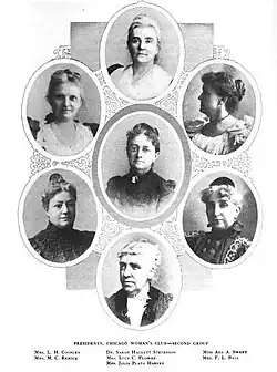 The Chicago Woman's Club was formed in 1876 by women in Chicago who were interested in "self and social improvement."[1] The club was notable for creating educational opportunities in the Chicago region and helped create the first juvenile court in the United States.[1] The group was primarily made up of wealthy and middle-class white women, with physicians, lawyers and university professors playing "prominent roles."[2] The club often worked towards social and educational reform in Chicago. It also hosted talks by prominent women, including artists and suffragists.[3][4][5][6][7][8][9][10]