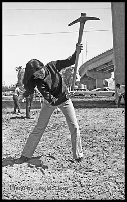 Solis went door-to-door to spread the news of the construction. At school, he alerted the students of Professor Gil Robledo's Chicano studies class, who printed fliers to bring more attention to the affair. At noon that day, Mexican-American high school students walked out of their classes to join other neighbors who had already congregated at the site.[15] Some protesters formed human chains around the bulldozers, while others planted trees, flowers, and cactus.[9] Solis is reported to have commandeered a bulldozer to flatten the land for planting. Also, the flag of Aztlán was raised on an old telephone pole, marking a symbolic "reclamation" of land that was once Mexico by people of Mexican descent.[9]