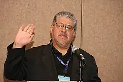 Chicano playwriting emerged in the 1960s firstly through the work of Luis Valdez with Teatro Campesino.[3] Chicano playwriting emerged with a dedication to the farmworker's political struggle for rights.[3] Valdez himself stated: "We don’t think in terms of art," but in terms of message to the audience.[3] By 1973, there were about thirty Chicano theater groups, including Teatro de la Esperanza under Jorge A. Huerta.[3]