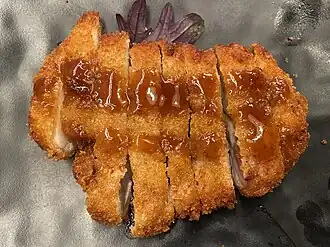 In Hawaii, chicken katsu is more popular than tonkatsu and substitutes for it in dishes such as katsukarē and katsudon.[3] In a plate lunch, chicken katsu is generally served on a bed of shredded cabbage,[4] with a well-seasoned ketchup similar to cocktail sauce.[5][6]