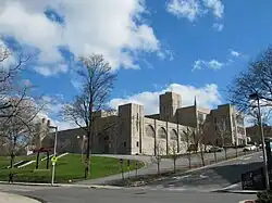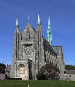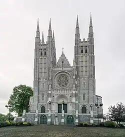 In the last years of their partnership O'Connell, as an individual, was tentatively retained as architect for the Basilica of Saints Peter and Paul (1938, NRHP-listed) in Lewiston, Maine. He was not formally awarded the contract until 1933 and construction began in 1934. This church, later elevated to basilica status, was planned with the idea in mind that a second diocese might be established in Maine with its seat in Lewiston. The resulting building, with a design derived from English and Norman cathedrals, is the second-largest church in New England.[1][22] Little is known about his work after the basilica; two are the rectory (1943) of Mary Immaculate of Lourdes Catholic Church in Newton[23] and St. Pius V Catholic Church (1949) in Lynn, Massachusetts, completed when he was eighty years old.[24] He closed his office and retired in the 1950s.[1]