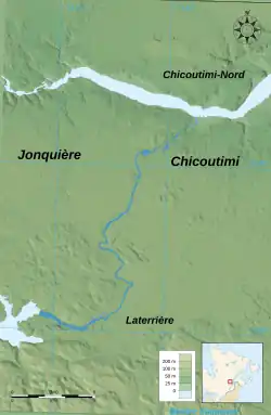 Flowing from south to north, the Chicoutimi River rises east of Kenogami Lake via the Portage-des-Roches dam in the old town from Laterrière (today Chicoutimi borough to Saguenay (city)). This river is artificially controlled over 26.2 km (16.3 mi) [5] in distance and 150 m (490 ft) in elevation for a century.[6]