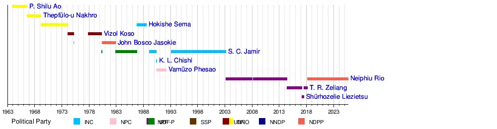Since 1963, eleven people belonging to seven parties have served as chief minister of Nagaland. The first three belonged to the Nagaland Nationalist Organisation, including the inaugural officeholder P. Shilu Ao. The current incumbent is Neiphiu Rio of the Nationalist Democratic Progressive Party, in office since 8 March 2018.