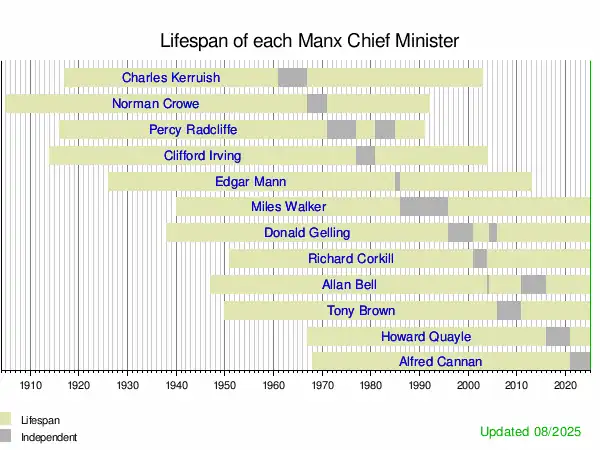 This is a graphical lifespan timeline of Chief Ministers of the Isle of Man. Twelve people have served as Chief Minister of the Isle of Man since 1961. They are listed in order of office (Radcliffe, Gelling, and Bell are shown in order of their first terms).