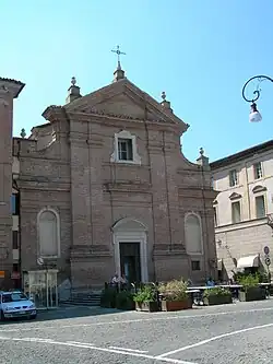The brick facade has monumental pilasters upholding a triangular tympanum, flanking a white stone portal with a rounded pediment. In the presbytery are two chapels dedicated to Saints Sebastian and Lucy. An elliptical dome covers the nave, with a cupula frescoed with Jesus in Glory with Angels. The main altarpiece depicts Christ and the Souls in Purgatory by the studio of Biagio Puccini, which also painted the works in the lateral chapels.[1]