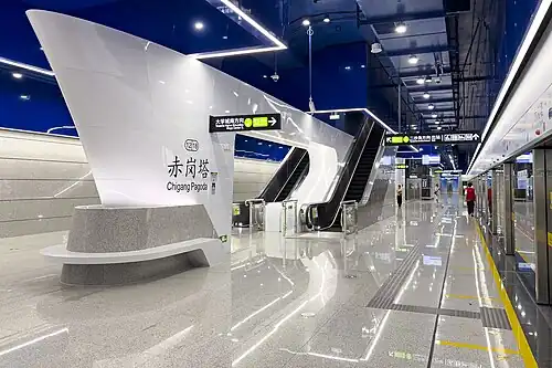 Chigang Pagoda station (simplified Chinese: 赤岗塔站; traditional Chinese: 赤崗塔站; pinyin: Chìgǎng Tǎ Zhàn; Cantonese Yale: Cěkgōng Taap Jaahm) is a station on Line 12 of the Guangzhou Metro.[1] It is located underground on the east side of the intersection of Yizhou Road and Yiyuan Road in Guangzhou's Haizhu District. It opened on 29 June 2025.[2]