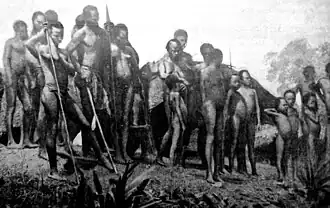 In order to ensure a regular supply, "the chiefs raise herds of [children], like we do with sheep or geese at home", stated a missionary after a trip along the Ubangi.[93] Several accounts indicate that children were indeed fattened and slaughtered on a regular basis. While one or two victims per village and week seem to have been typical, Augouard also mentions "a village which I know well, [where] a child aged ten to twelve was sacrificed every day to serve as food for the chief and the principals of the area," thus also indicating that the regular enjoyment of such dishes was a privilege of the influential and well-connected.[94] The killing of slave children for culinary purposes is also documented for various other parts of the Congo Basin, including the north and northeast,[95] the Maniema region in the east,[96] and the Kasai region in the south.[97]