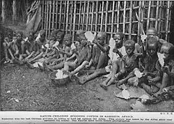 The growth of colonial rule in Africa, from 1650 to 1950, by powers such as Britain, France, Belgium, Germany and Netherlands encouraged and continued the practice of child labour. Colonial administrators preferred Africa's traditional kin-ordered modes of production, that is hiring a household for work not just the adults. Millions of children worked in colonial agricultural plantations, mines and domestic service industries.[15][20] Children in these colonies between the ages of 5–14 were hired as apprentice without pay in exchange for learning a craft. Colonial British laws, for example, offered the native people ownership to some of the native land in exchange for making labor of wife and children available to colonial government's needs such as in farms and as picannins.[21]