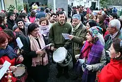 These masses are highly attended, because besides the religious side, they have a profane, playful and recreational side. In them, the choir and the faithful sing the songs of the occasion. At the end of the liturgical act, the people gather in the churchyard together, share food and drink - hot drinks (hot cocoa, coffee), liquors, poncha, traditional Christmas sweets, sandwiches made with carne de vinha d'alhos - all while singing groups are formed and regional musical instruments are played, such as rajão, castanets, braguinha or machete, pandeiro, pife, bombo and the bagpipe or harmonica. Although it is less frequent nowadays, fireworks are also launched.[1][6][5]