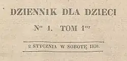 Dziennik dla dzieci (English: Children's Daily) was the first daily newspaper marketed for children, published in Warsaw from January 2 to December 31, 1830. It was one of several periodicals aimed at children published in the partitioned Poland. It was established and run by Stanisław Jachowicz, a renowned Polish educator, philanthropist, poet, and fabulist. Aimed at children of wealthy families, it developed social and civic education of the youngest generation through articles on festivals, current events, nature, maths, tourism, Polish language etc. as well as through reviews of children's literature. The daily actively engaged its audience by publishing texts submitted by children. It was discontinued after 299 issues.