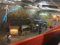 The museum featured a city street (with cars and motorcycles) with a sewer system that could be crawled through, Grandma's attic with wearable costumes, a large Lego play area, and a section called Sticky City consisting of large stuffed fabric blocks with Velcro that stuck to each other and could be used for building. There was also a TV studio where children could be camera operators or news anchors, a large photosensitive wall that would imprint shadows when a strobe light was set off, a workshop where visitors could make their own Zoetrope animations, and other activities.