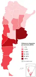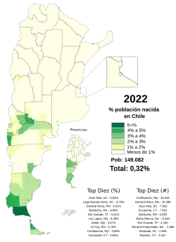 Chilean Argentines are Argentine citizens of Chilean descent or Chile-born people who reside in Argentina. Argentina is home to the largest Chilean diaspora group. According to the Argentine 2010 census, there are 191.147 Chileans living in the country (born in Chilean territory). An estimate 2003-2004 estimated Chilean descendants, born in Argentina to a Chilean father or mother, in 190,000.[3]