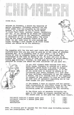 In 1969, Don Turnbull published the first British Dippy zine, Albion,[1] and this was followed by a large number of others. In June 1975, Clive Booth published the first edition of Chimaera as a monthly four-page spirit-duplicated Dippy zine, but stated in his introduction "I do not want Chimaera to develop into just another Diplomacy 'zine. I would like to start and play in these pages games of a different genre, in fact any game on the market that is adaptable to postal rules." Despite Booth's decision to include other games, this took some months to organize, and the first five issues only offered Diplomacy.[1]