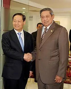 On May 25, 2025, Chinese Premier Li Qiang met with President Prabowo Subianto to discuss expanding trade relations amid a divisive global market and the mass installation of tariffs against foreign nations by the United States under President Donald Trump.[56] The visit in Jakarta, which included 60 prominent Chinese businessmen, was noted by Premier Li as occurring in the same year as the 70th anniversary of the founding of the Non-Aligned Movement.[56] At the talks, Premier Li encouraged Chinese investment in the Indonesian market.[56]