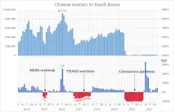- ^ "3월 중국인 관광객 39% 줄어… '사드 보복' 영향" [Chinese tourists decrease by 39% in March ... Impact of 'THAAD Revenge']. Yonhap News. April 5, 2017. Archived from the original on April 5, 2017. Retrieved April 5, 2017.