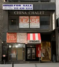 China Chalet permanently closed in 2020. Though no reason for the closure was given, the economic downturn prompted by the COVID-19 pandemic was speculated as a probable cause by multiple outlets.[4][5][7] Two additional China Chalet locations operated, on the Upper East Side and in Eltingville, Staten Island, respectively. The Eltingville location opened in 2006 and closed in 2020,[8] while the Upper East Side location closed by 2021.[9]