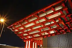 The chosen design was selected from a range of 344 design proposals put forward by architects from all over the world.[2] The chief architect of the pavilion was 72-year-old He Jingtang, the director of the Architectural Academy of the South China University of Technology.[2][6] The construction of the China pavilion began on 18 December 2007 and was completed in November 2009. On 8 February 2010, the completion of construction was commemorated by almost 1,000 people including the pavilion's designers and construction workers.[2]